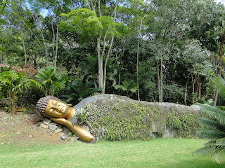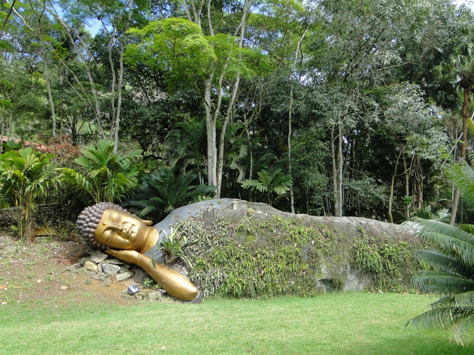 Recentemente, a imagem do Buda morto foi instalado, deixando ainda mais lindo o local. Reparem que apenas a cabeça e um braço da imagem foram feitos, sendo aproveitada a pedra que existia no local para formar o corpo.