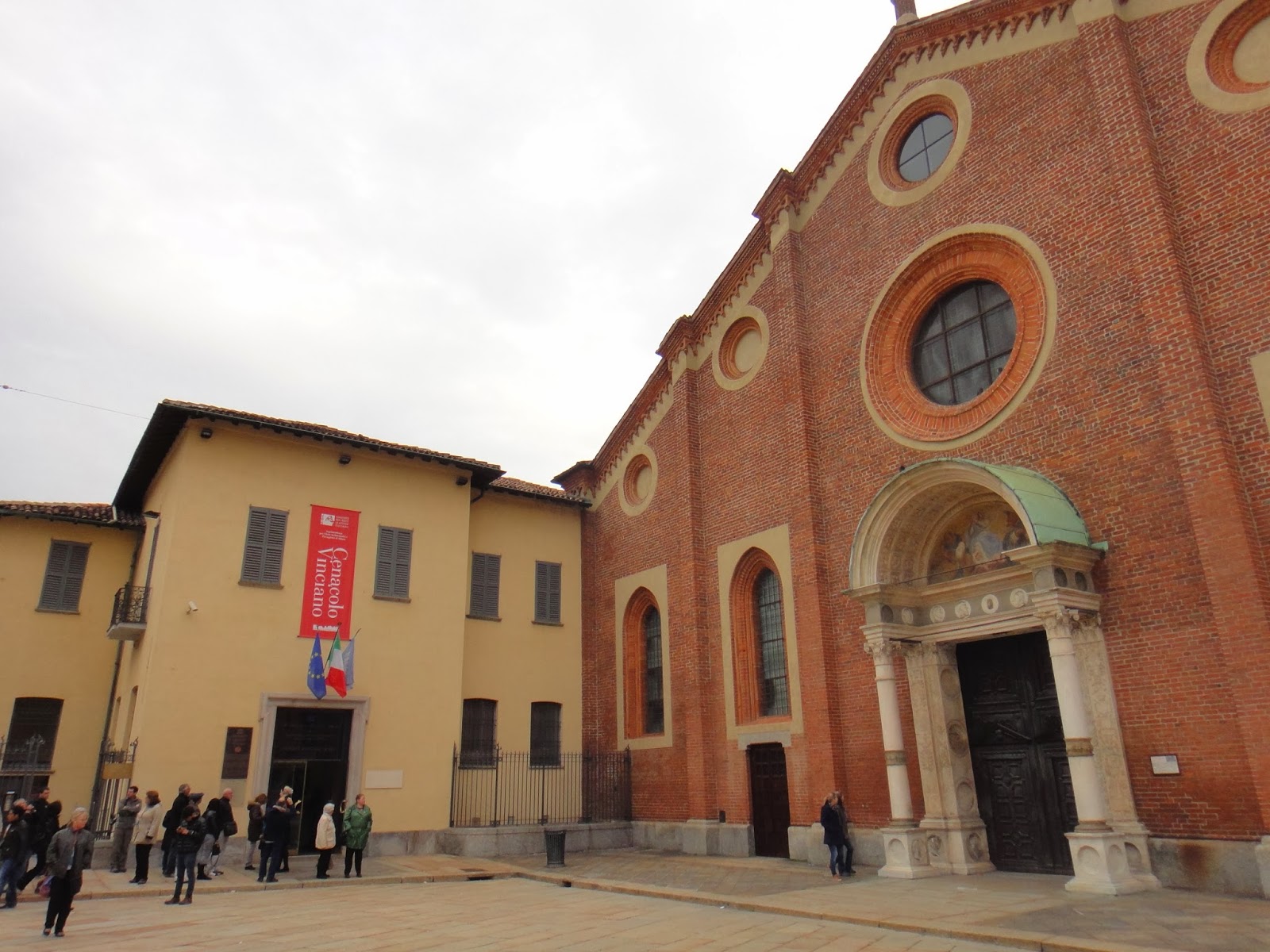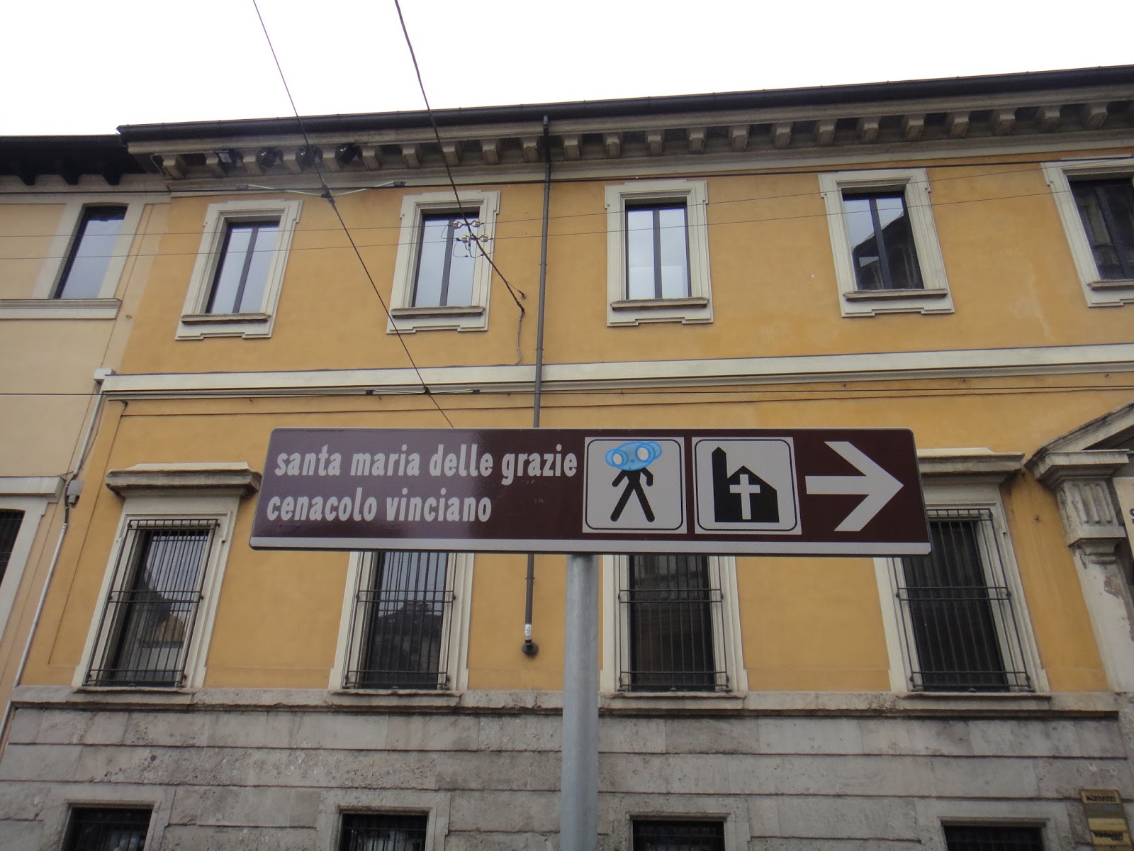 De lá seguimos para ver a Santa Ceia, pois já tínhamos o horário agendado (lembrem-se: esse era o motivo para estar em Milão!). Ansiedade infinita... Próximo ao local, há apenas pequenas placas (foto abaixo) que indicam o caminho certo. No entorno da Igreja Santa Maria Delle Grazie, conseguimos almoçar em um pequeno bar/restaurante (não foi nada demais, era minúsculo, e cheio de adolescentes), e me pareceu não ser muito explorada, para fins turísticos, a área.