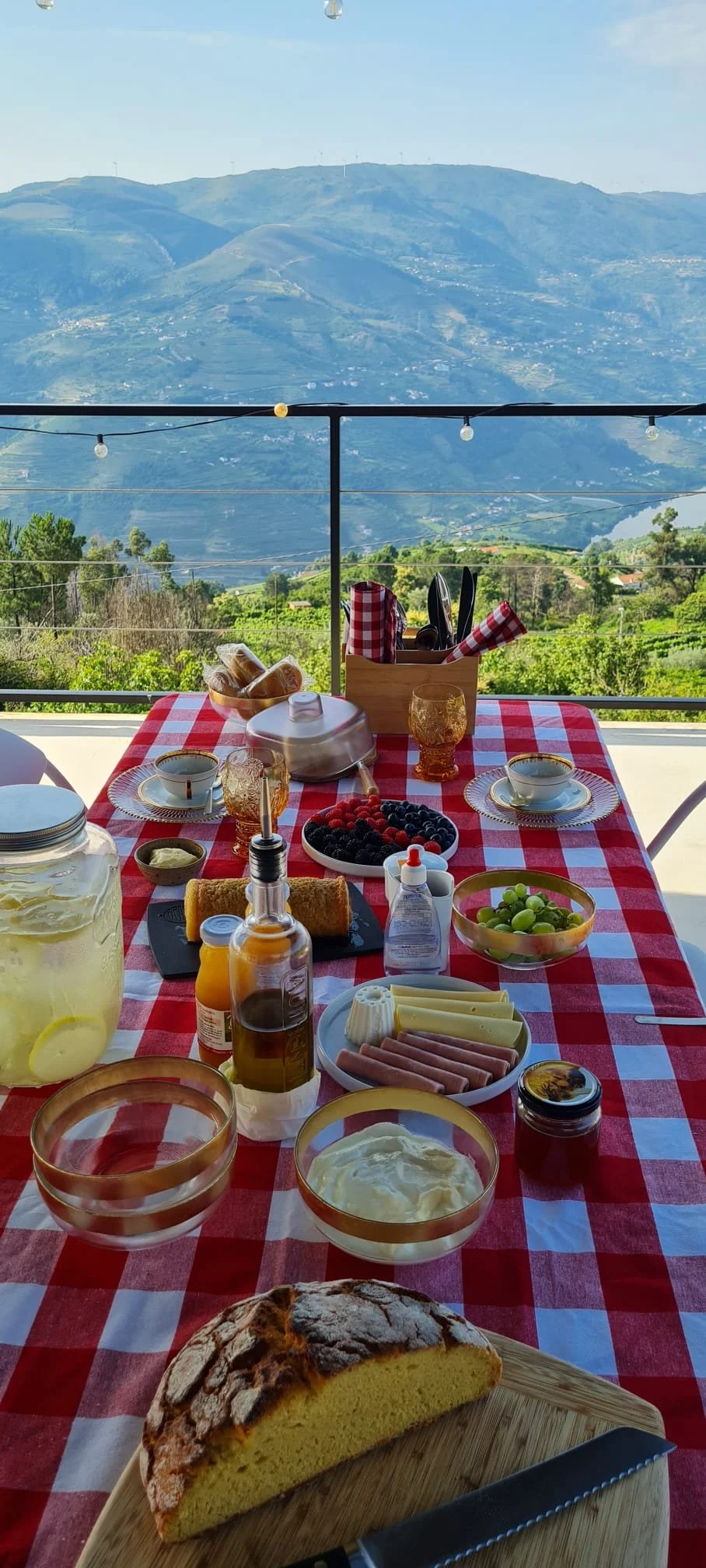 As diárias incluem café da manhã - que pode ser tomado no quarto ou na varanda da Quinta . Optamos pela varanda, pois aquela “janela do Douro” é incansável de ser apreciada.