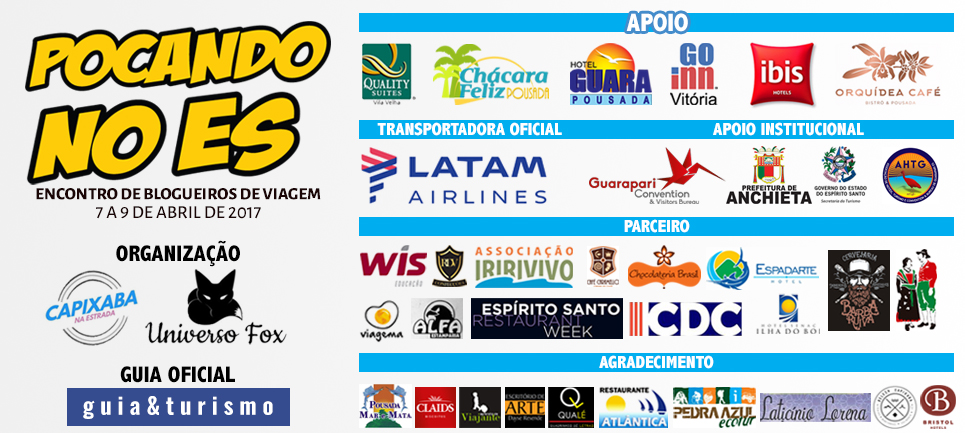 Organização: Capixaba na Estrada, Universo FoxGuia Oficial: Guia & TurismoApoio: Quality Suites Vila Velha, Chácara Feliz Pousada, Hotel Guara Pousada, Go inn Vitória, Ibis, Orquídea CaféTransportadora Oficial: Latam AirlinesApoio Institucional: Guarapari Convention, Prefeitura de Anchieta, Governo do Estado do Espírito Santo, AHTGParceiro: Wis, RDV Confecções, Associaçã Iririvivo, Café Caramelo, Chocolateria Brasil, Espadarte Hotel, Cervejaria Barba Ruiva, Viagema, Alfa, Restaurante Week, CDC, Hotel Ilha do Boi, Cantina MattielloAgradecimento: Pousada Mar e Mata, Claids, Aprendiz de Viajantes, Escritório Arte Dayse Resende, Qual é Quadrinhos, Restaurante Atlântica, Pedra Azul Ecotur, Laticínio Lorena, Loja Beleza Capixaba, Bristol Hotels